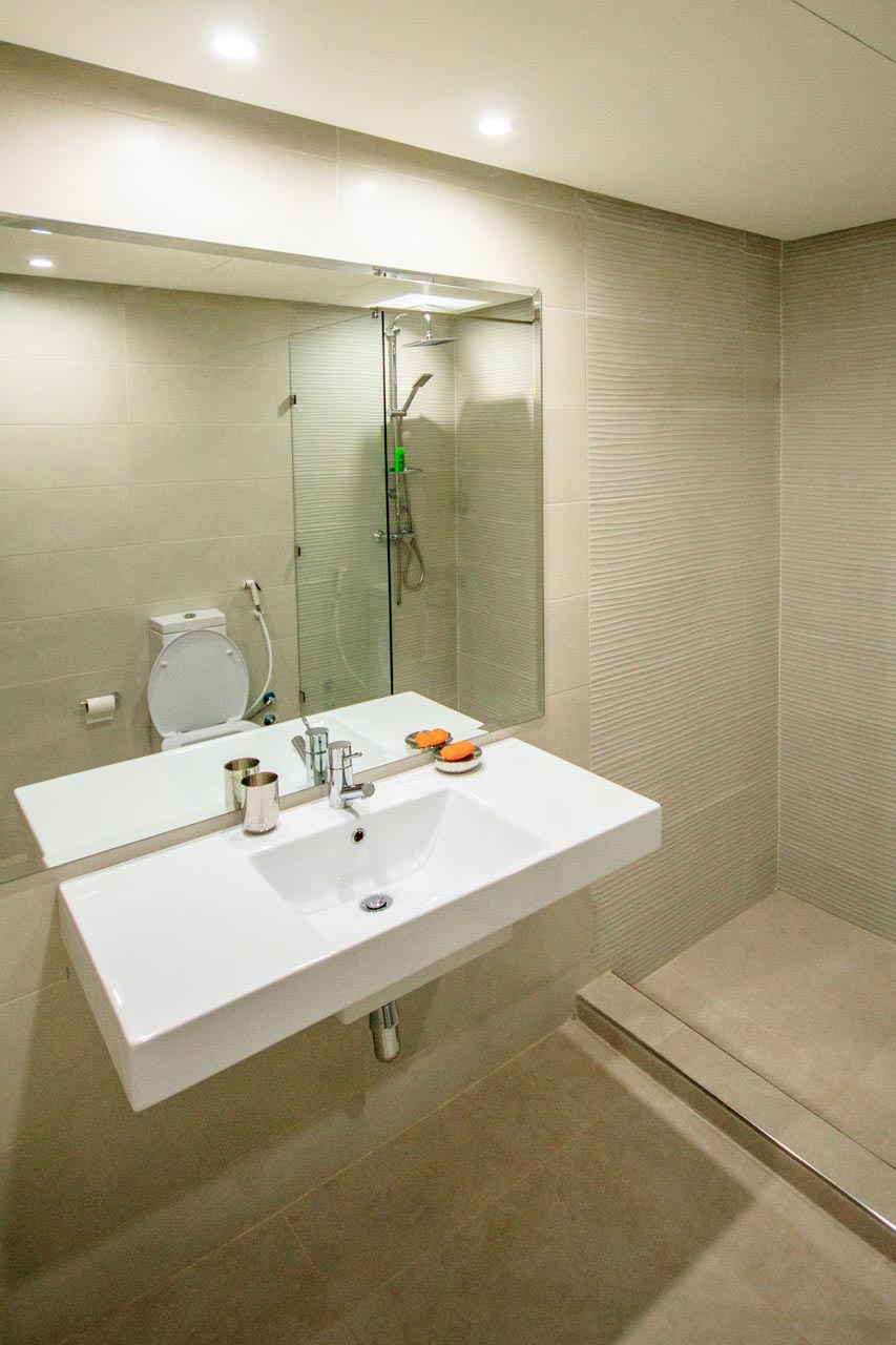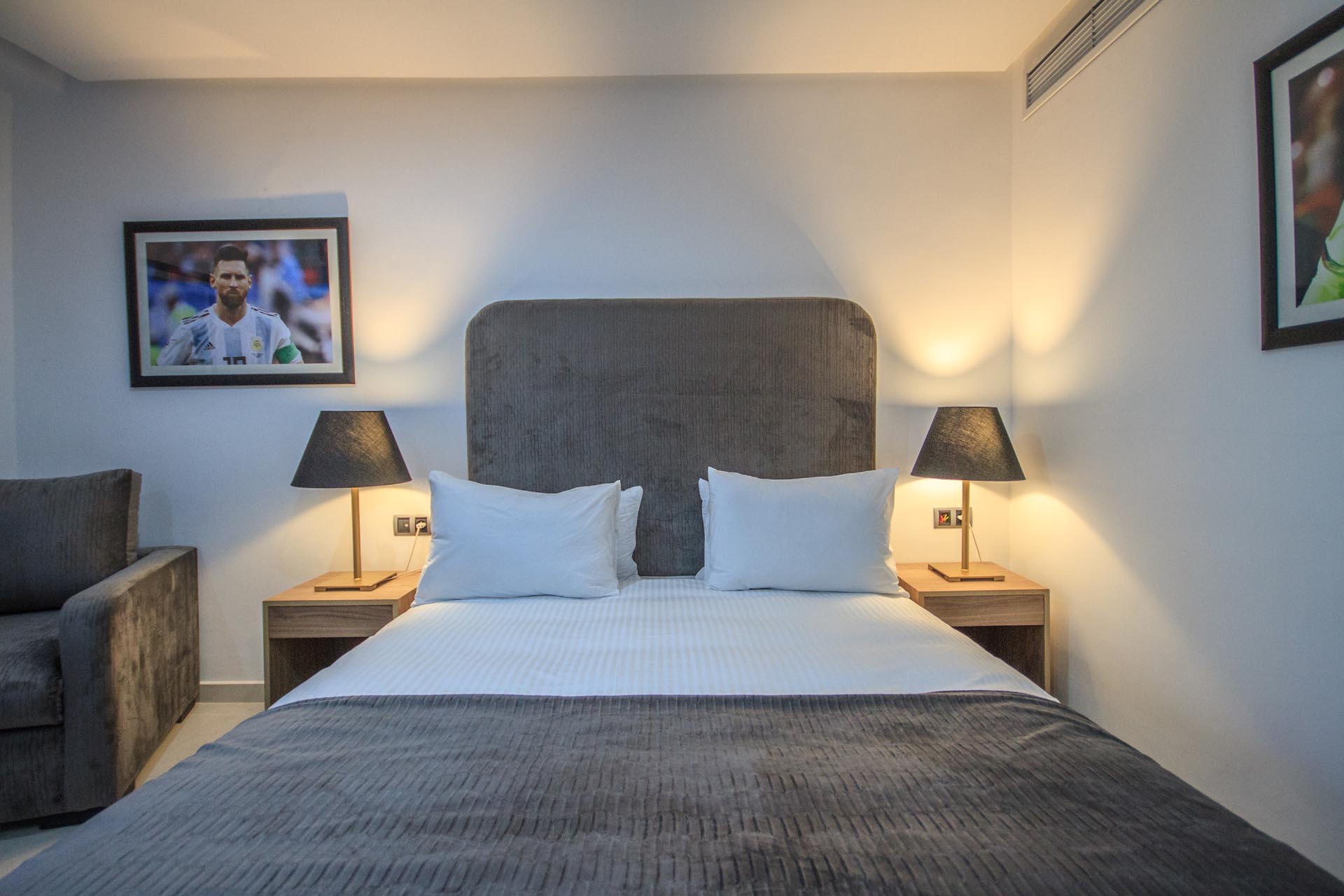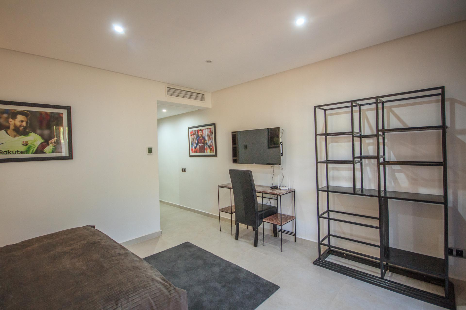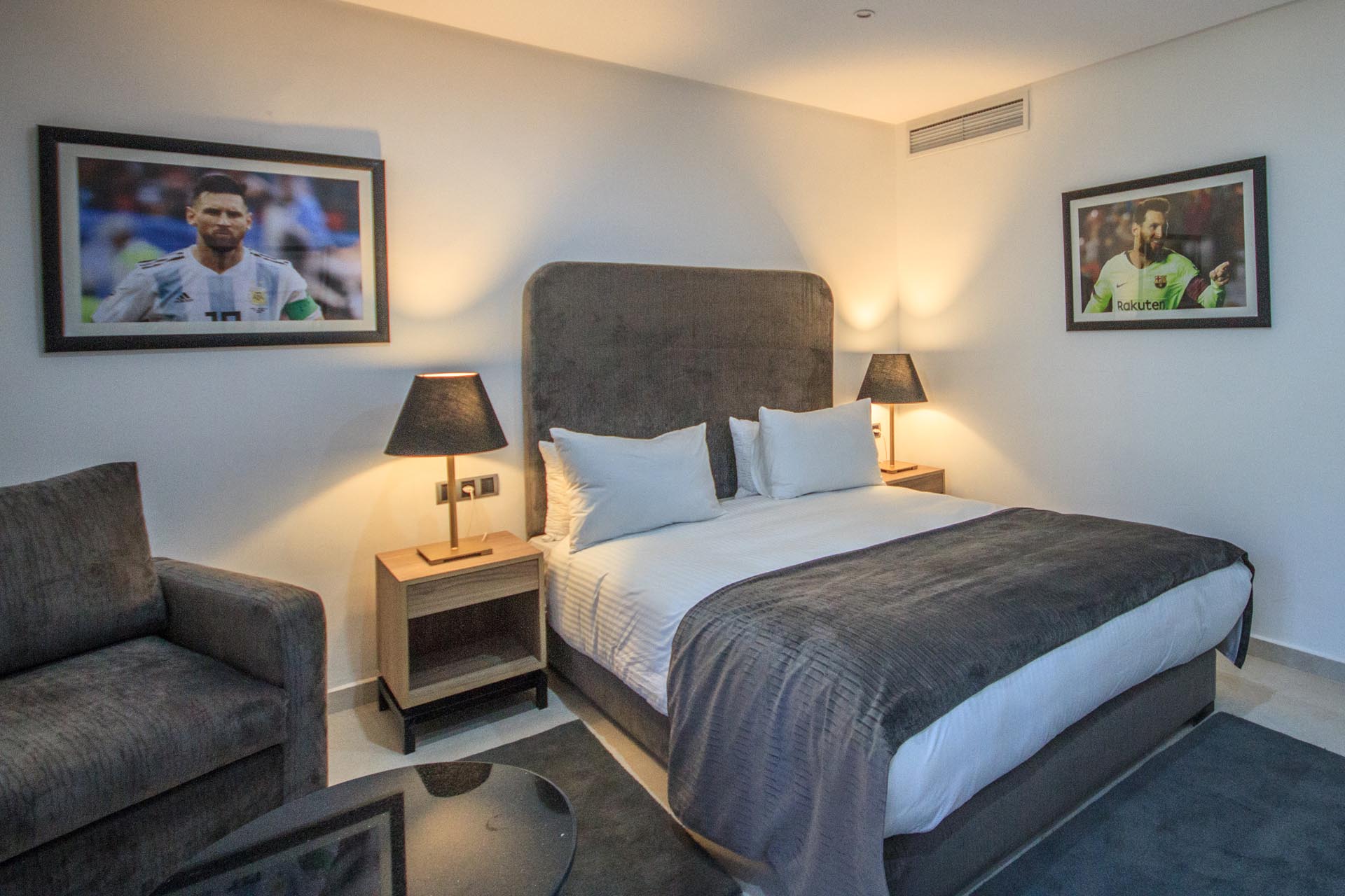 Chambre coquette de 34m² moderne, donnant sur le jardin, récente, joliment décorée avec des tableaux de la légende du Football Lionel Messi, petit coin télé avec fauteuil et table ronde, salle de bains avec douche.
