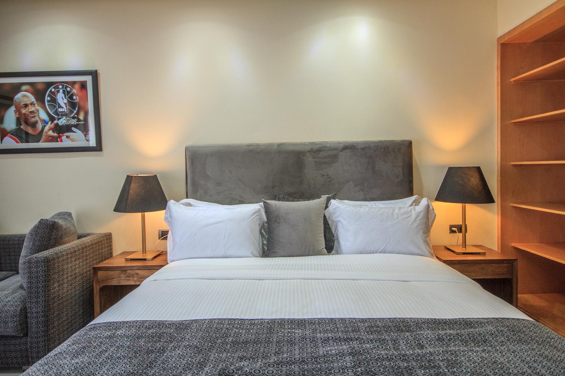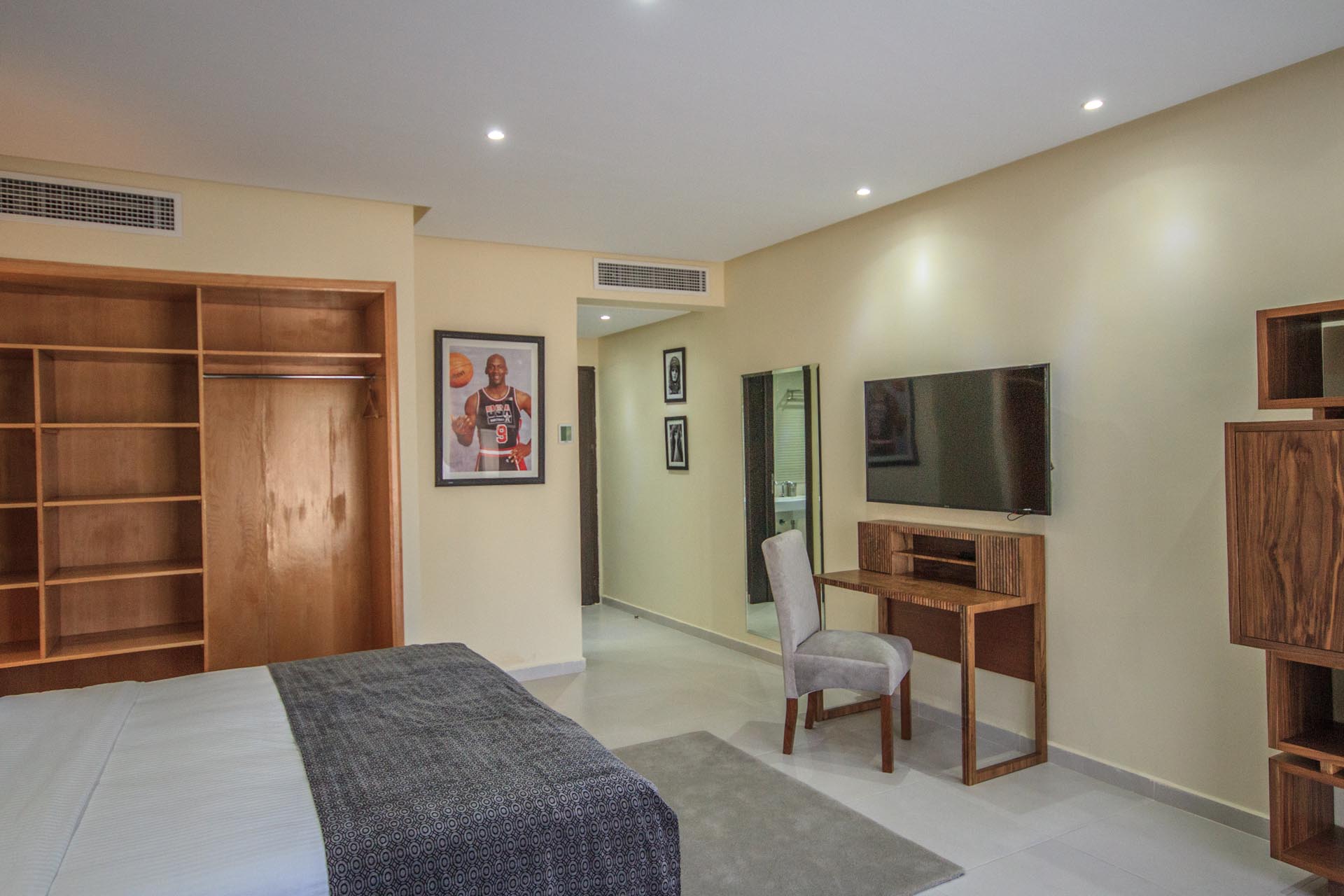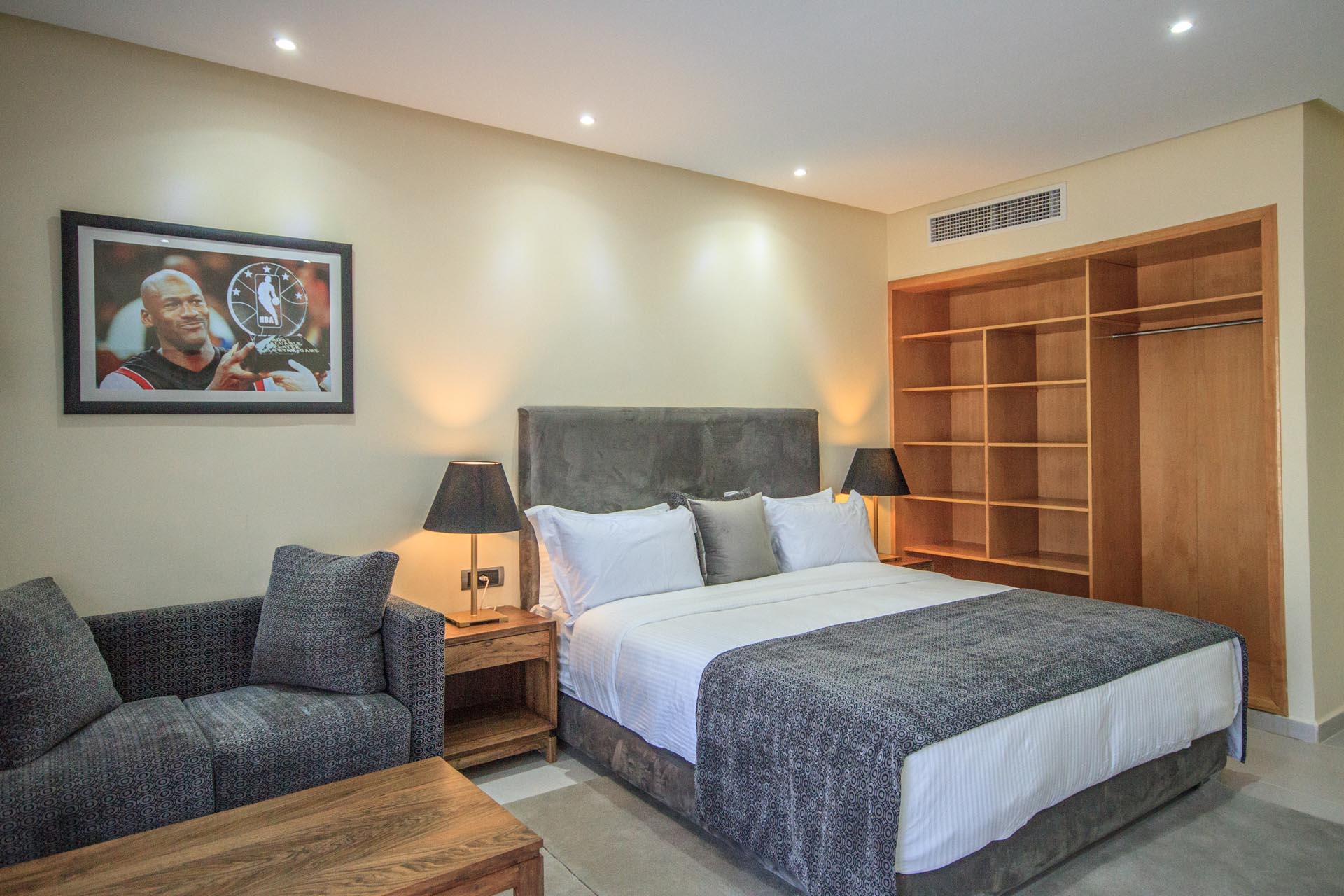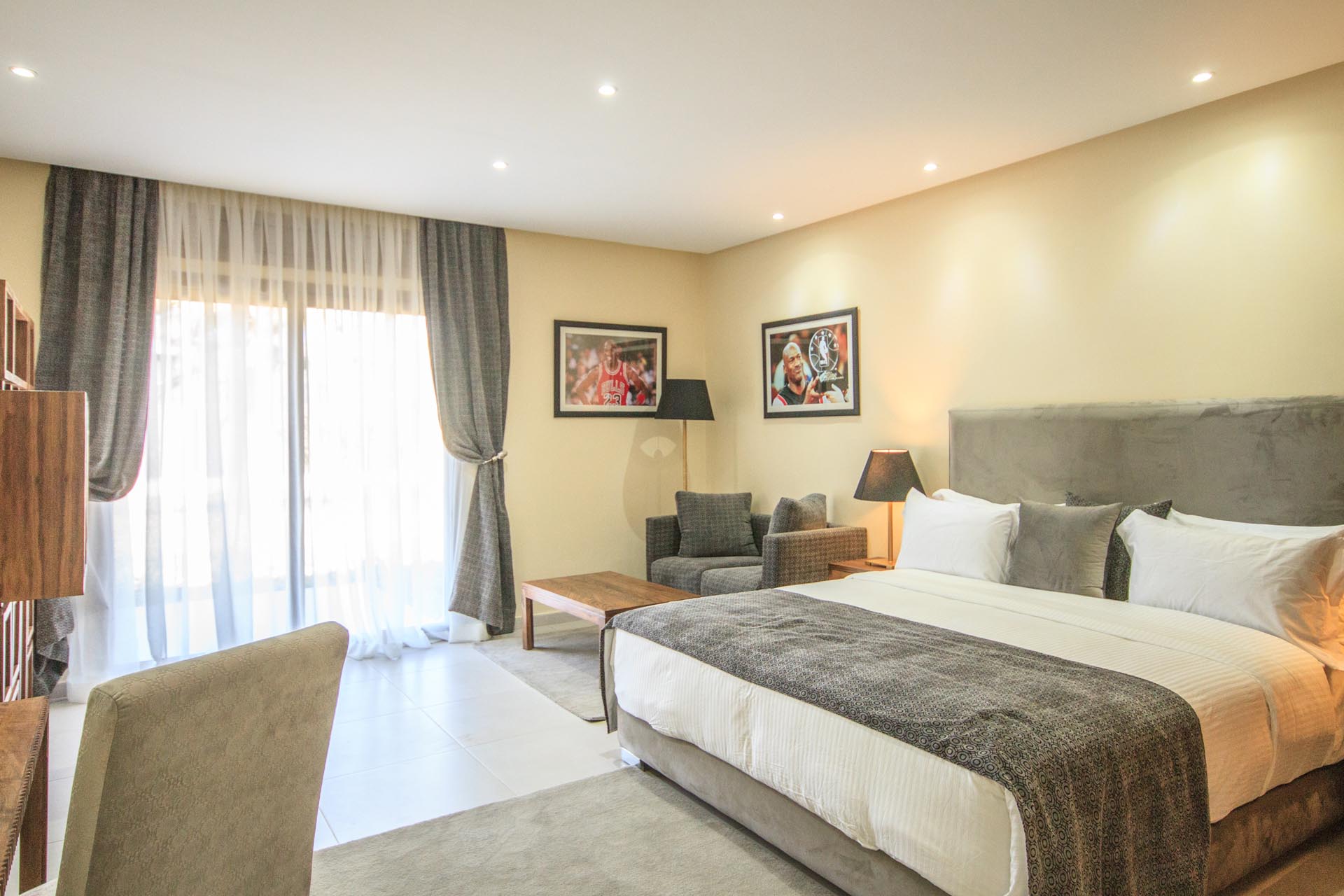 Chambre spacieuse de 47m², moderne avec des lignes épurées. Meuble de qualité en bois noyé, petit coin salon canapé et table, salle de bains avec double lavabo et douche. Terrasse de 8m². Décorée de quelques tablaux de la légende du Basket ball Michael Jordan.