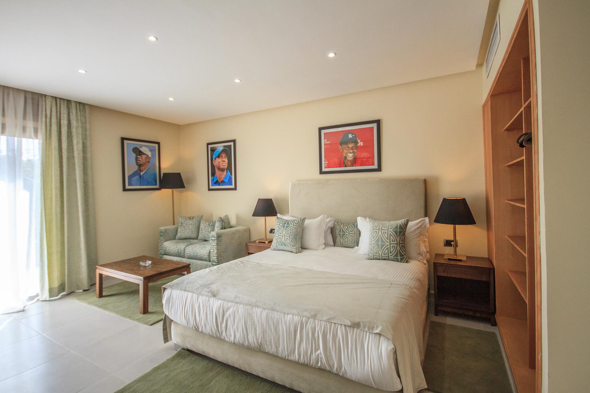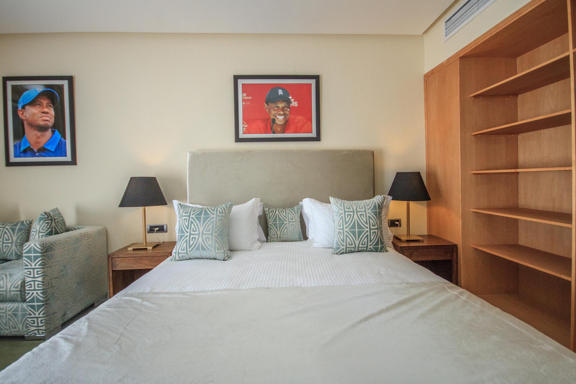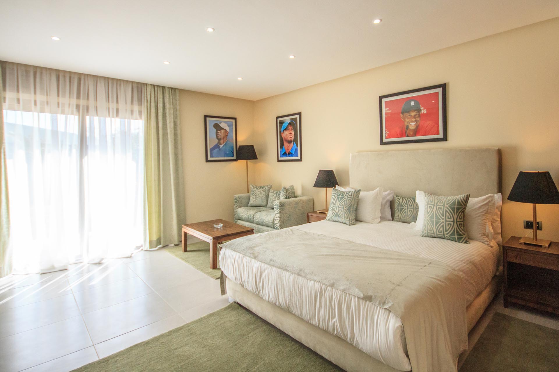 Chambre spacieuse de 47m², moderne avec des lignes épurées. Meuble de qualité en bois noyé, petit coin salon canapé et table, salle de bains avec double lavabo et douche. Terrasse de 8m². Décorée de quelques tablaux du célebre joueur de Golf Tiger Woods.