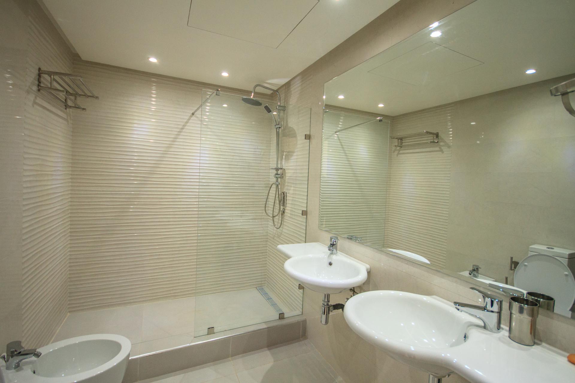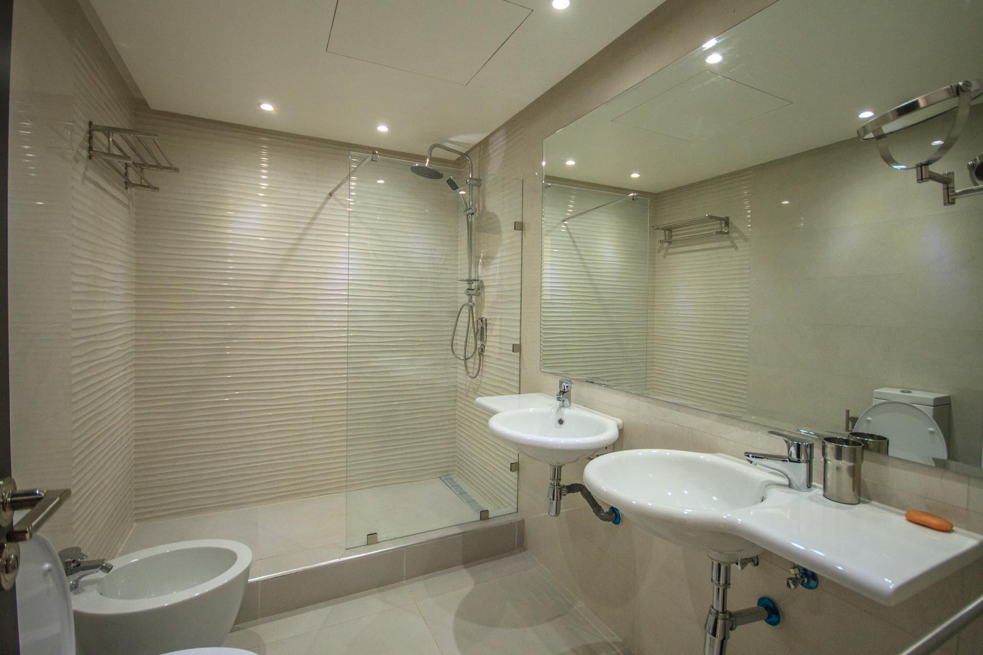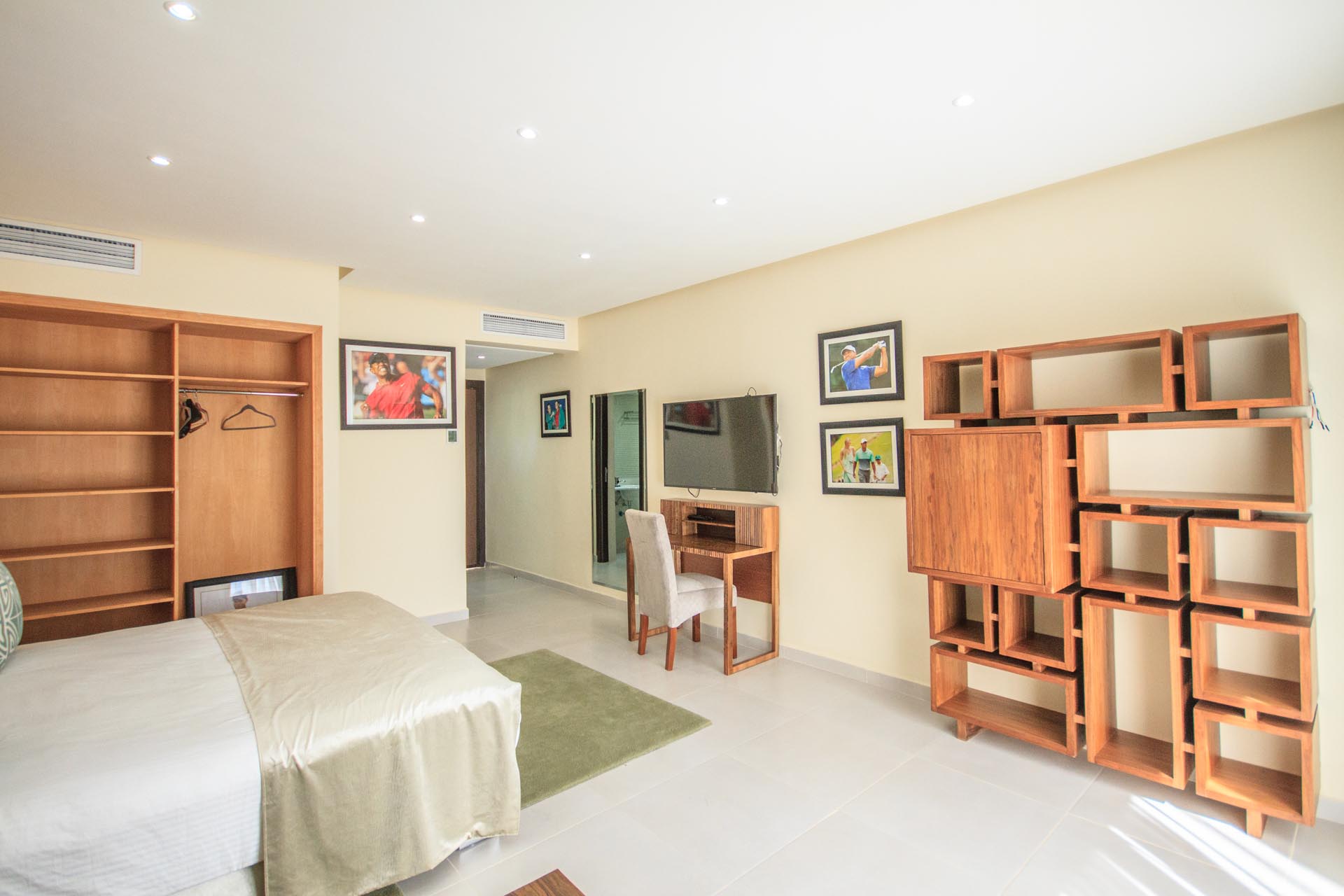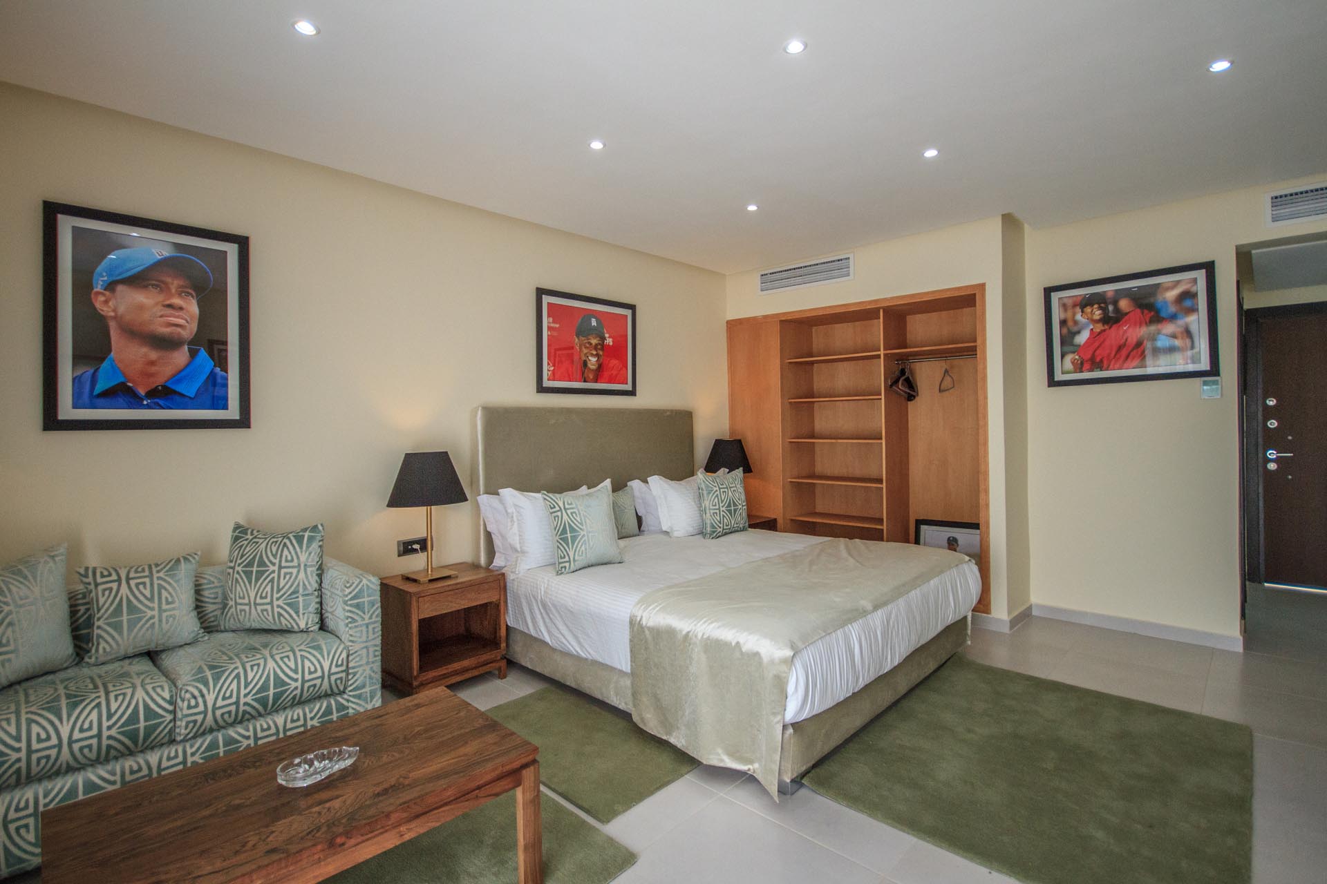 Chambre spacieuse de 47m², moderne avec des lignes épurées. Meuble de qualité en bois noyé, petit coin salon canapé et table, salle de bains avec double lavabo et douche. Terrasse de 8m². Décorée de quelques tablaux du célebre joueur de Golf Tiger Woods.